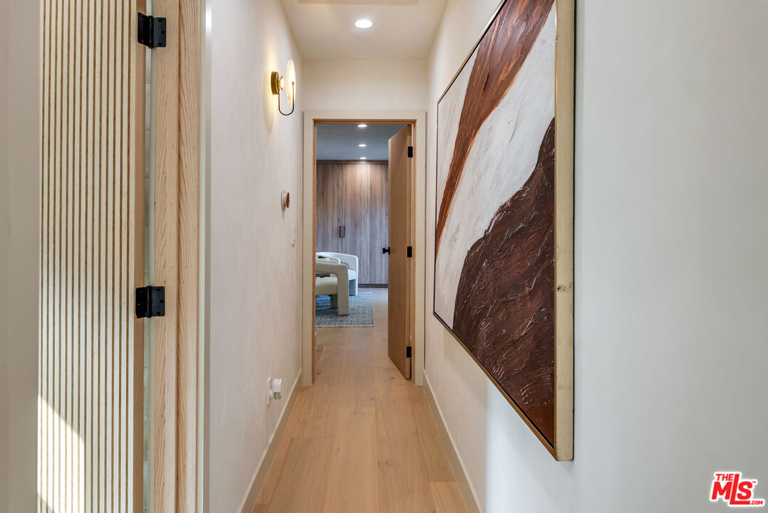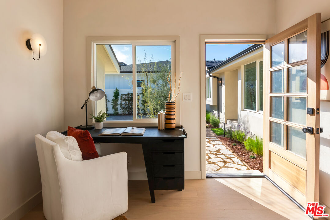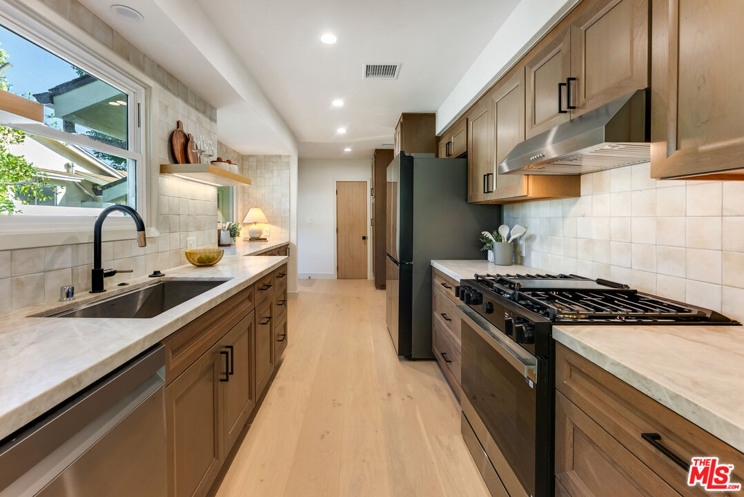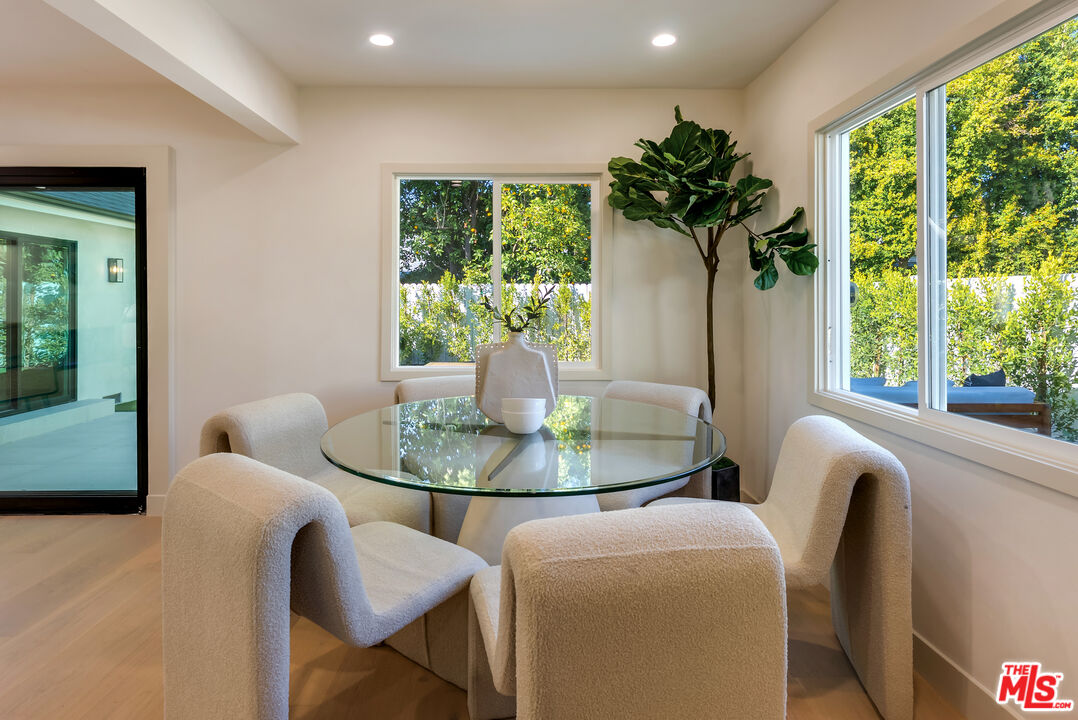 Tucked away on one of the most sought-after streets in Sherman Oaks, this move-in ready, luxurious modern oasis has been fully updated to blend sophisticated style, energy efficiency, and everyday comfort. Thoughtfully re-designed, this single-story Mediterranean modern features engineered hardwood flooring throughout, all complemented by lime washed walls and custom designer finishes. Step inside to discover a bright, open-concept living space featuring a refinished fireplace, a chic dry bar, and oversized sliding glass doors that create the ultimate indoor-outdoor flow. The sleek, chef's dream kitchen is equipped with Taj Mahal quartzite, Samsung appliances, custom cabinetry, and ample storage, while a charming window-framed breakfast nook provides the perfect spot for morning coffee. The primary suite is a private sanctuary, complete with a spa-inspired en-suite bathroom and direct patio access through more glass sliders. As a bonus, there is also a flex room ideal as a home office, creative studio, or guest retreat with its own separate entrance, while the dedicated laundry room adds additional storage and everyday convenience. Designed for low-maintenance, this cozy backyard space is an entertainer's paradise w/ built in speakers and outdoor spaces that wraps nearly all the way around the entire home . Enjoy a built-in BBQ & refrigerator, drought-tolerant landscaping, artificial turf, and an automatic gate so your pets and kiddos are free to play w/ peace of mind. The fully finished two-car garage offers endless possibilities whether you need extra storage, a home gym, or a smart home workspace. If you're looking for modern living with minimal upkeep just a short distance to the Sportsmen's Lodge and great schools, this turn-key, smart home is a must-see!